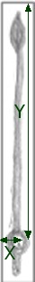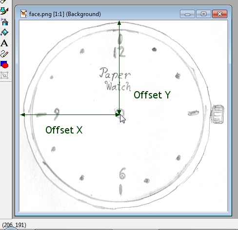 To add a hand, you have to specify two coordinates: the offset on the watch face, and the centre of rotation on the hand itself. Imagine you are pinning the hand to the face with a needle, and measure where in the hand and the face the holes need to go. Measuring is best done in your graphics editor of choice, since the values are in pixels. Graphics tools usually display the position of the cursor somewhere. See below, where the position is displayed in the lower left corner. So, the x-offset is 206, and the y-offset 191