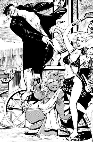 An excerpt from the Bacchus 4000 Birthday Bash. This great Poster is available from the Comic Book Legal Defense Fund; support them, buy it! It is limited, signed, and has naked ladies and a half naked Mick on it, too...