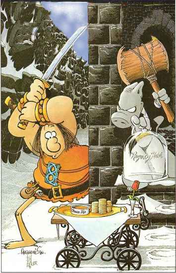 Sergio Aragones' Groo the Wanderer meets Cerebus, or rather his hammer, on the cover of Amazing Heroes from '87.