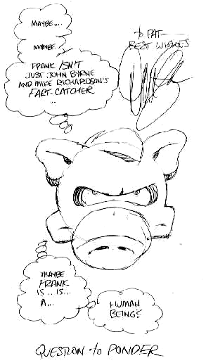 Head sketch of a Cerebus in deep thought. Or rather surrounded by Dave's thought, one might guess. He refres to Frank Miller's speech at the 1994 Diamond Comic Distributors Retailers Seminar.