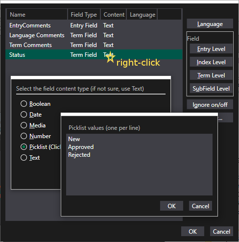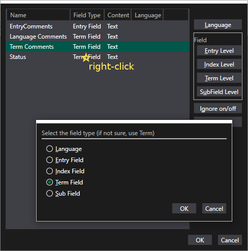 - Click the button corresponding to the field type (Language or Entry/Index/Term level). In case of Language, a dialog will pop up from which you can select the language.