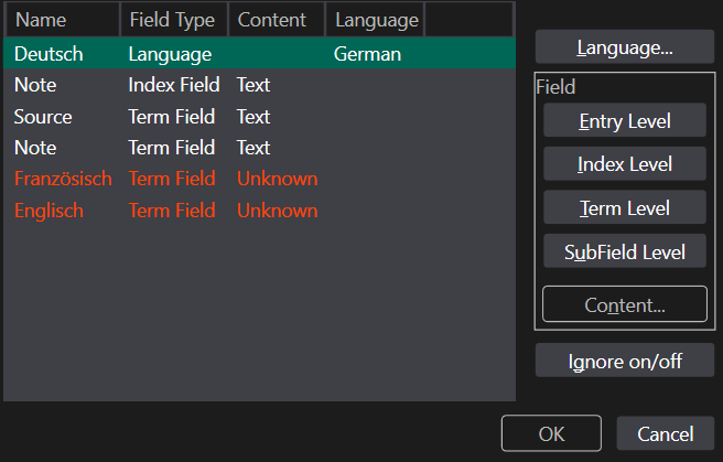 Glossary Converter tries to handle everything as automatically as possible, but in some cases the user needs to specify the meaning of fields, or define a language. In that case, a dialog like the following pops up. It shows only the unknown fields to this conversion. They are not marked as unknown (coloured red), since the converter makes some educated guesses. For example the most common fields are plain text term level fields, therefore unknown fields are set up be Term Field/Text. This saves quite a few clicks in most data.