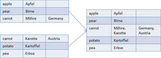 Fields attached to a term are merged along with the term. Again, there is no magic understanding of what a term means. But at least, if there are for example comment fields, they are preserved and may help to distinguish multiple translations.