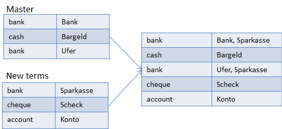That means, if you have two entries with the same source term (homonyms), they will remain separate, even if the new termbase has a new translation. How does the Converter know which homonym to chose? It doesn't, so to be on the safe side, it adds the new term to both. Which means that one of them is definitely wrong, but you have to make a compromise here. Again, it's a good idea to do some quality control after merging.