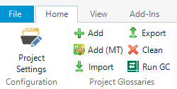 This is the visible part of the plugin in all its glory. If the installation works, this is what you see in the Home tab of Trados Studio. It's only active when the projects view is selected, and some actions may be grayed out, depending on the project.