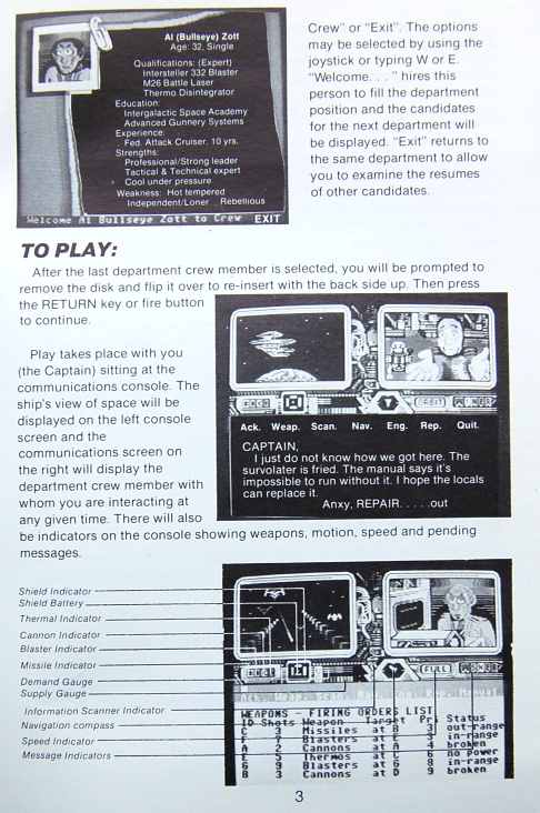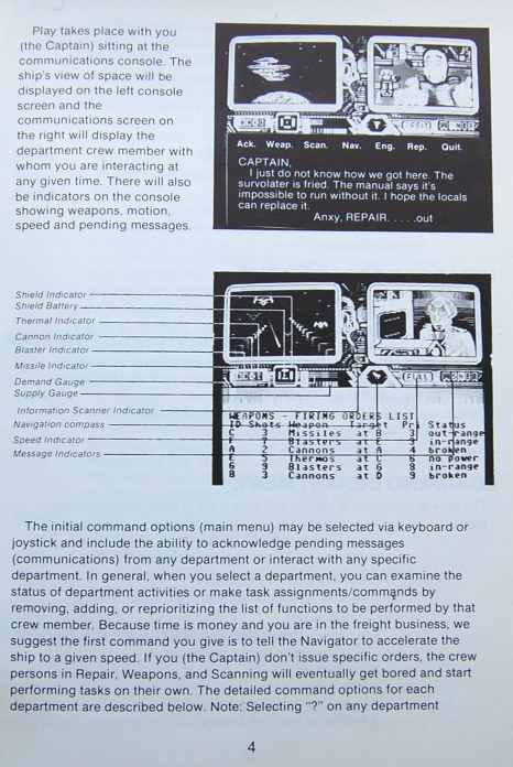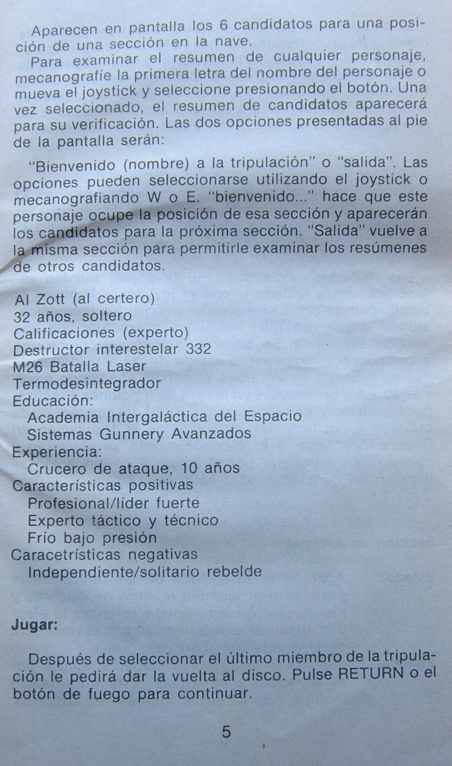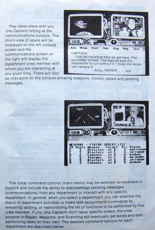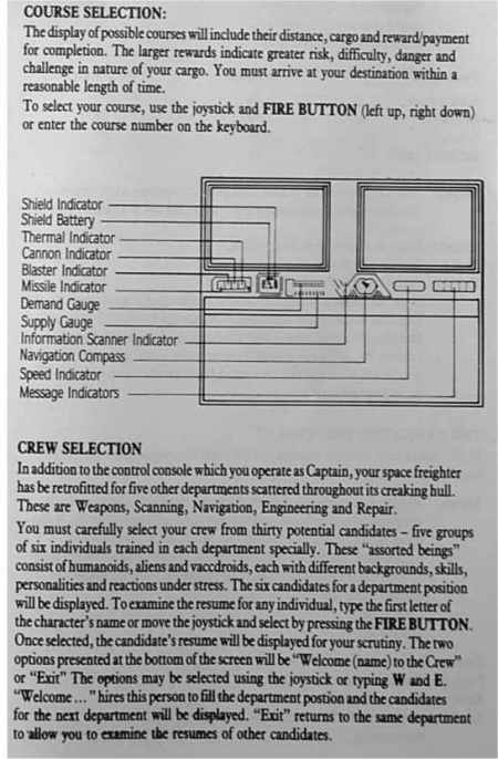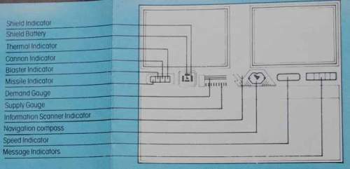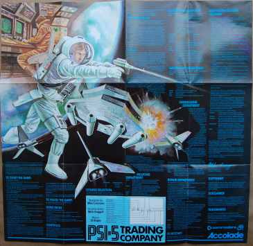 Europeans got a nice space poster instead of a booklet, 36 x 36 cm, on good glossy paper. While it looks very different and has no screen shots, it does contain the full text of the US C64 version and an instrument diagram. There is only a specific C64 edition, keyboard controls for CPC/Spectrum are added on a small leaflet. |