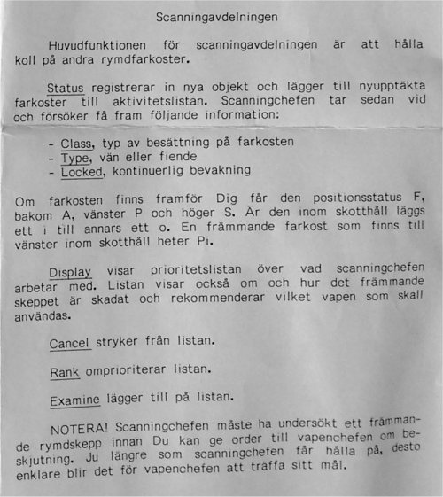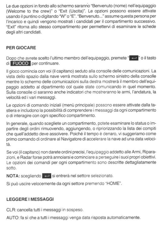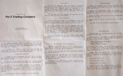 Sweden's PSI 5 captains needed to be smart. They only got a severely truncated manual. It provides a terse description of how to start, and what each screen shows. It just about allows you to play, but lacks any atmosphere, detail, or graphics. See for yourself in this slightly smoothed machine translation. | Italy distributed the PC version in 1987, and included a decent manual printed on matte white paper. It contains all the info of the C64 original, including the Admiral Lorenzen letter, all translated to Italian. None of the extras from the PC release, or any of the graphics are included, though. |